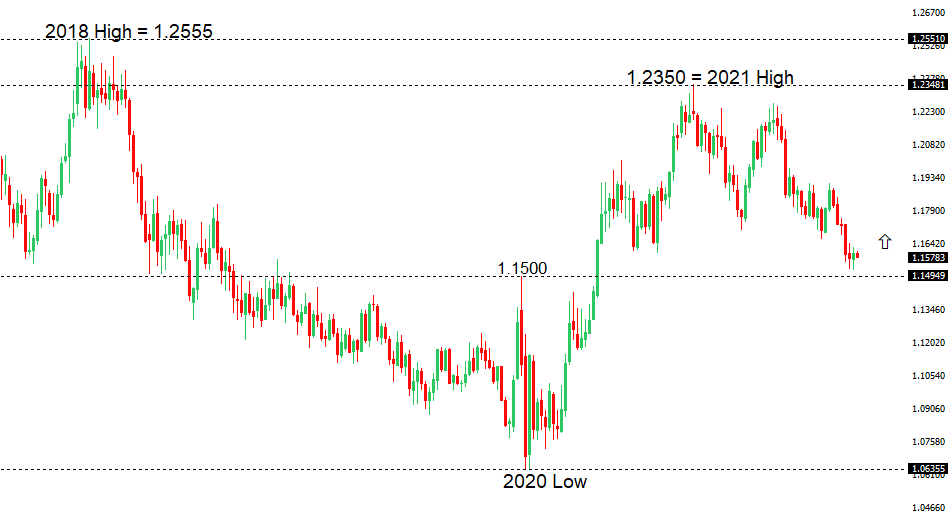 The market has been looking for a higher low since topping out in 2021 up at 1.2350. Ideally, setbacks continue to be well supported above 1.1500 on a weekly close basis in favour of the next major upside extension back through 1.2350 and towards a retest of the 2018 high at 1.2555 further up. Only a weekly close below 1.1500 would force a rethink.