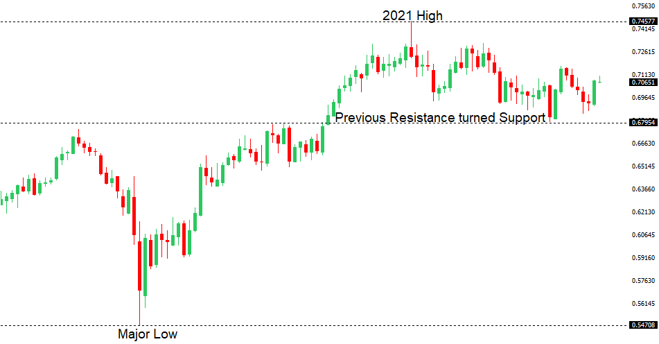 The market has entered a period of consolidation after running up to a yearly and multi-month high. At this stage, rallies should be well capped and there is still room for deeper setbacks into the 0.6500-0.6800 area before we see an attempt at a higher low and resumption of upside pressure. Back above the April high at 0.7317 would be required to force a shift in the structure.