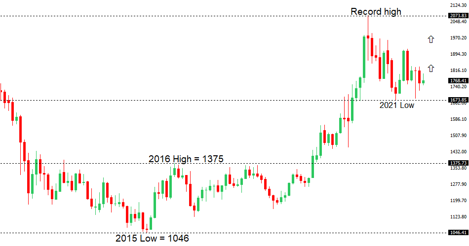 The 2019 breakout above the 2016 high at 1375 was a significant development, opening the door for fresh record highs and an acceleration beyond the next major psychological barrier at 2000. Setbacks should now be well supported above 1600.