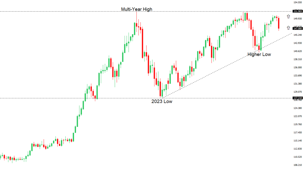 The market remains confined to a strong uptrend, with sights set on a retest and break of the multi-year high from 2022 at 151.95. A push through this level will open the next major upside extension towards 155.00. Key support comes in at 145.90, with only a weekly close below to delay the constructive outlook.USDJPY – fundamental overview