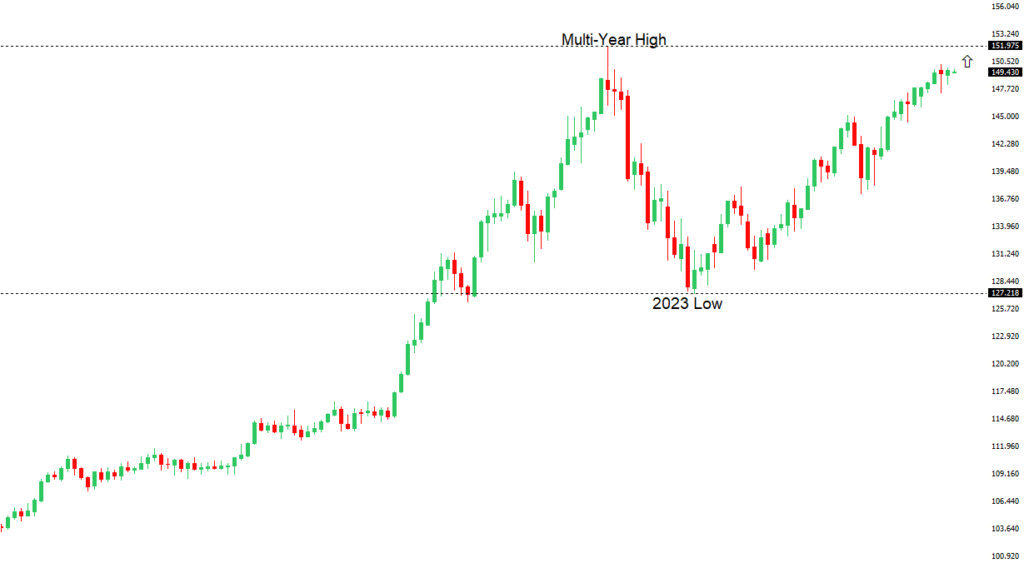 At this stage, it looks like the market is wanting to resume the bigger picture uptrend and head back towards a retest of that multi-year high from October 2022 up at 151.95. Look for any weakness to continue to be well supported on dips.USDJPY – fundamental overview