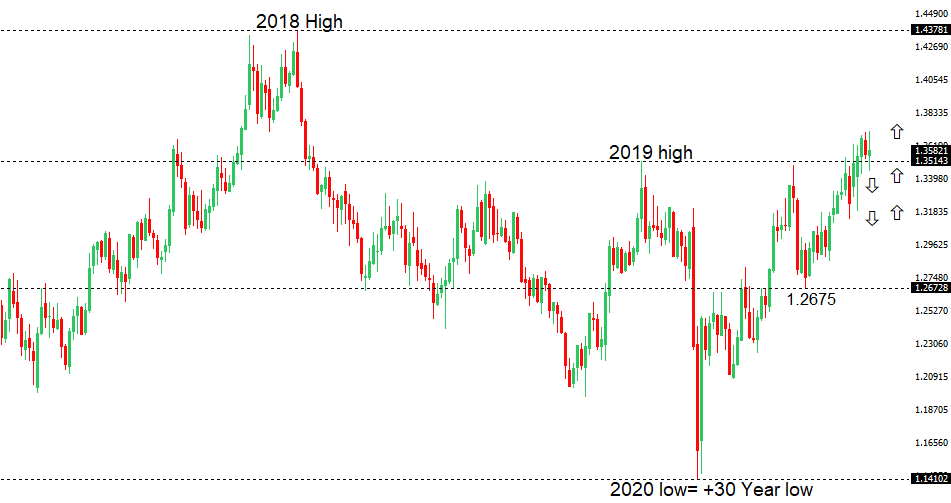 The recent breakout through the 2019 high at 1.3515 is significant and now sets the stage for the next major upside extension back towards 1.4000. Technical studies are however unwinding from extended readings, leaving room for some setbacks before the market starts to make its way higher. But look for setbacks to now be very well supported ahead of 1.3000.GBPUSD – fundamental overview