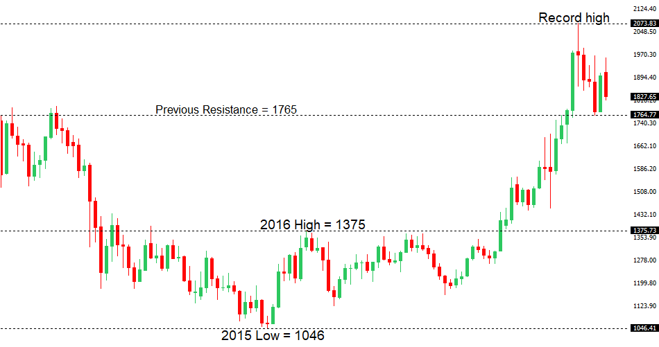 We're trading just off fresh record highs, and yet, with so little room for additional central bank accommodation, given an already depressed interest rate environment, the prospect for sustainable runs to the topside on easy money policy incentives and government stimulus, should no longer be as enticing to investors. Meanwhile, ongoing worry associated with coronavirus fallout should weigh more heavily on investor sentiment in 2021.GOLD (SPOT) – technical overview