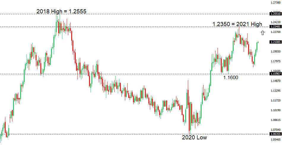 The market has been looking for a higher low since topping out in 2021 up at 1.2350. Ideally, this next higher low is sought out ahead of 1.1600 in favour of the next major upside extension back through 1.2350 and towards a retest of the 2018 high at 1.2555 further up.EURUSD – fundamental overview