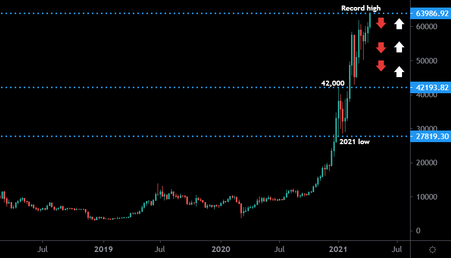 Heading into 2021, there was a great anticipation for institutional adoption. And as we saw follow through on this anticipation, the bitcoin price tripled in value, exploding to a record high beyond $60,000. But with much of that now priced into the market, and with short-term bitcoin fundamentals still correlating with global risk sentiment, there does appear to be room for somewhat of an adjustment lower in the price before we see that next wave of renewed demand. We also believe bitcoin's emergence into the mainstream will invite more challenge and scrutiny from central banks and governments, which could translate to a bumpy ride in Q2 2021 before the asset once again finds its legs on the compelling longer-term value proposition.BTCUSD - Technical charts in detail