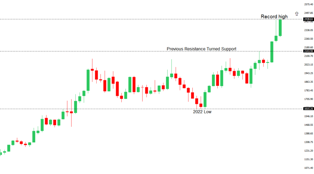 Though we have seen a healthy adjustment of investor expectations towards the amount of rate cuts in 2024, the market still hopes policy will end up erring more towards the investor friendly, accommodative side of things. This bet has kept stocks well bid into dips and consistently pushing record highs.GOLD (SPOT) – technical overview