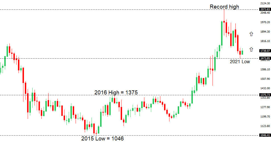 Ether is in the process of an overdue price correction and consolidation after an explosive start to 2021 that resulted in fresh record highs beyond $2,000. There were already signs of overvaluation in the defi space and this in conjunction with a deterioration in global risk sentiment have been behind a lot of this downside pressure. Still, we believe there will be plenty of demand for ether down into the $1,000 area.