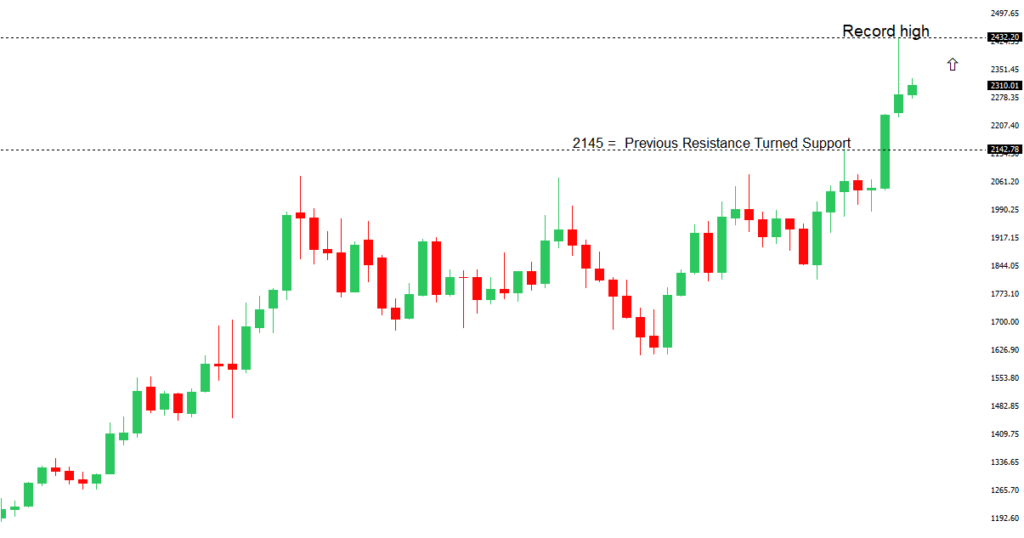 Though we have seen a healthy adjustment of investor expectations towards the amount of rate cuts in 2024, the market still hopes policy will end up erring more towards the investor friendly, accommodative side of things. This bet has kept stocks well bid into dips and consistently pushing record highs. The trouble right now is that inflation has been showing signs of ticking back up, all while the market contends with additional uncertainty around geopolitical risk.GOLD (SPOT) – technical overview