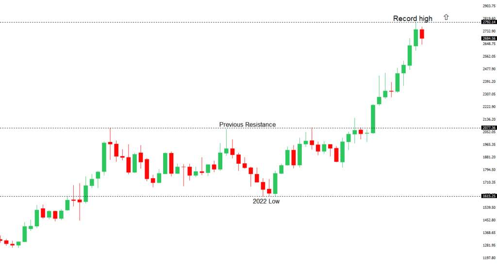 The US equities market remains exceptionally well supported in 2024 on the back of an ongoing expectation for more rate cuts than less going forward. Investors are feeling better about a soft landing in the US economy and this has also been accompanied by an accommodative adjustment of Fed policy. Moreover, there has been a fresh wave of market optimism in the aftermath of the Trump election victory. It will however be important to keep an eye on inflation, bigger picture economic data, and geopolitical risk in the weeks and months ahead.GOLD (SPOT) – technical overview