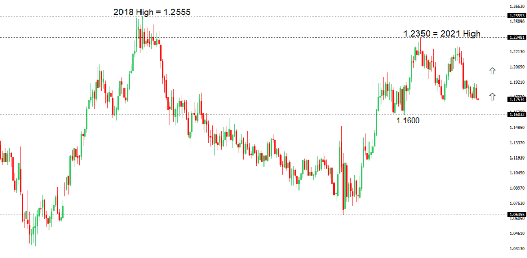 The market has been looking for a higher low since topping out in 2021 up at 1.2350. Ideally, setbacks continue to be well supported down towards 1.1600 in favour of the next major upside extension back through 1.2350 and towards a retest of the 2018 high at 1.2555 further up. Only a weekly close below 1.1600 would force a rethink.EURUSD – fundamental overview